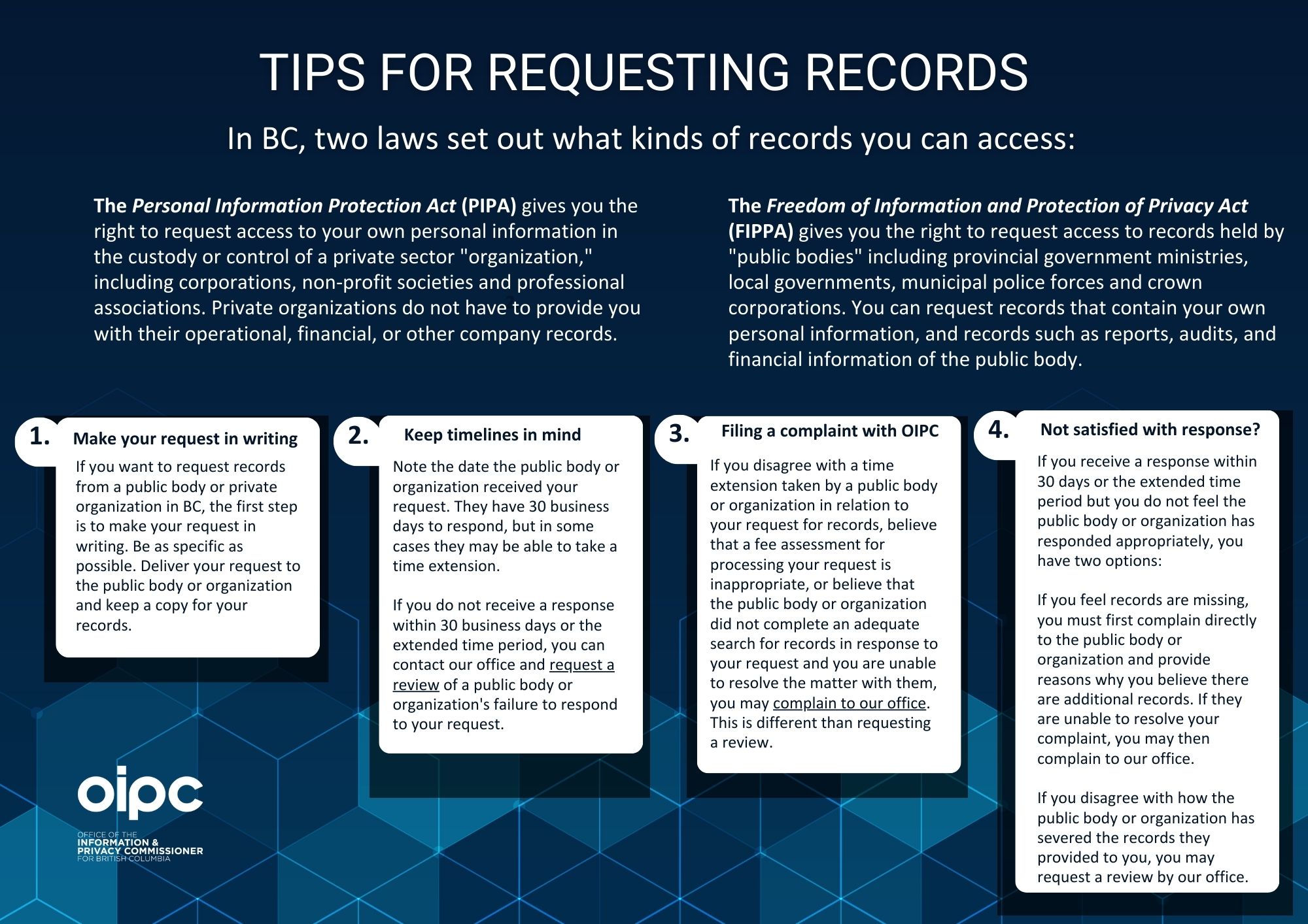 Highlighting British Columbians' access to information rights under the Freedom of Information and Protection of Privacy Act (FIPPA) and the Personal Information Protection Act (PIPA), including steps to access records under both acts. |